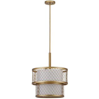 Glamorous, but with a fresh contemporary twist, the Evie mesh pendant is an intriguing design featuring a white cotton drum shade inside a nested set of outer drums crafted of steel mesh in a warm antique gold finish. Evie will dress up a room with style.