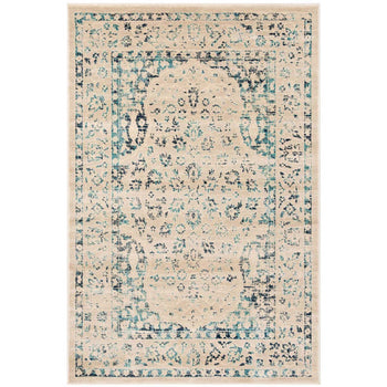 Elevate your living space with the timeless elegance of our 4' X 6' Beige/Turquoise area rug. This exquisite small rectangle rug is thoughtfully crafted in Turkey using a state-of-the-art power-loomed technique, ensuring a design with impeccable detail and durability.
