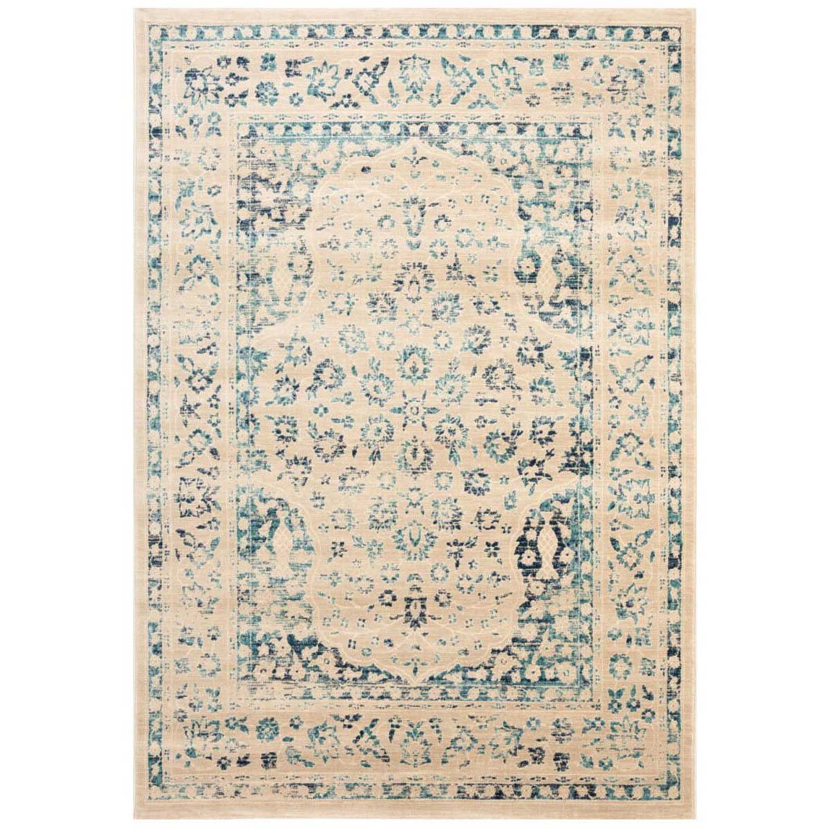 The blend of materials ? 62% Polypropylene, 30% Jute, 5% Polyester, 3% Cotton ? offers a delightful combination of durability, comfort, and easy maintenance. The refined beige backdrop is gracefully adorned with turquoise accents, showcasing a classic pattern that whispers sophistication and a subtle vintage charm that is sure to complement any room.