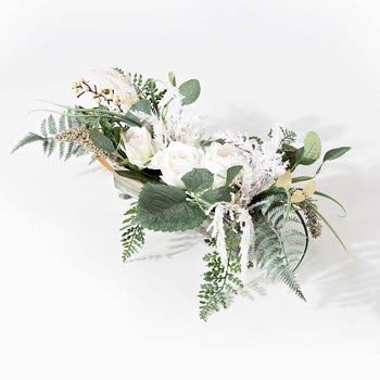 Bring an exuberant touch of nature to your home this spring season with our faux rose and fern potted arrangement. Combining lush and delicate greens with eye-catching rose blooms, our potted arrangement captures vibrant colors and lush textures. It is realistically rendered to create an enchanting springtime display that will last through the season. Hosted in a grey rectangular box, our faux potted arrangement brightens up your nightstand, coffee table, or buffet.