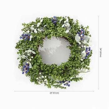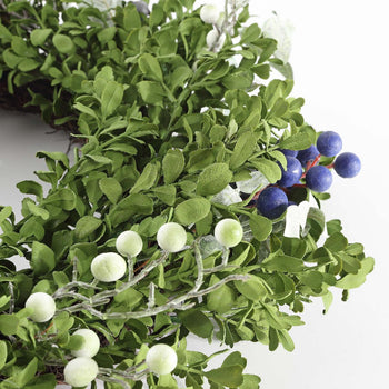 Bring a vibrant cheer of spring season to your home with our faux boxwood and berry wreath. The lush and versatile wreath combines vibrant blue berries and green boxwood foliage to blend with both traditional and modern decor. Enriched with lush textures, our faux wreath fools the eye with its lifelike detailing. The wreath brings an effortless touch of the spring season to your front porch, doorway, or mantelpiece.