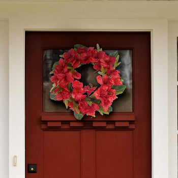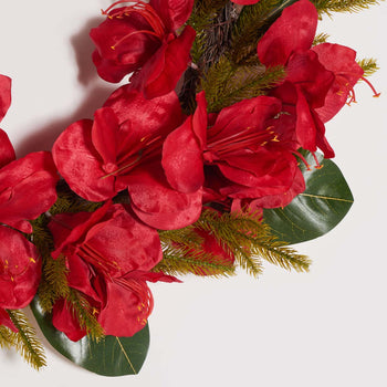 Add a lively splash of color to your festive decor with our faux amaryllis and a magnolia leaf wreath. Our holiday wreath stands out with the rich red crimson color of faux amaryllis blooms. It is complemented with deep-green magnolia leaves to bring striking organic beauty to your home. Each texture and detail is realistically rendered to keep the amaryllis flowers blooming through the winter season and beyond. It serves as an effortless and vibrant centerpiece for your doors, mantelpiece, and dining table.