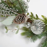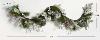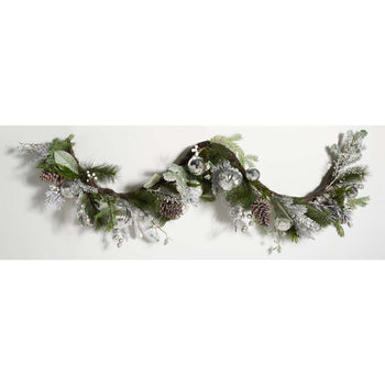 Bring wintry elegance to your holiday decor with our faux snowy pine garland with ornaments. The snowy pine needles of our garland capture the cool and crisp beauty of winter's'ss first frost. Its lush and lifelike foliage is complemented with shimmering silver ornament to deliver an enchanting festive display. Our faux garland adds an elegant dash of cheer to your table, mantel, or door frame.