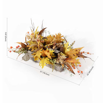 Give a warm and hearty welcome to the fall season with our faux oak and eucalyptus potted arrangement. The iconic oak and eucalyptus leaves are rendered in glowing golds, dusty oranges, and bright yellow to vouch for a warm and cozy look. Our faux arrangement realistically captures the elegant details and texture to become an effortless autumnal centerpiece for your home. Complement with a wooden planter, the faux arrangement lends festive organic touch to your nightstand, coffee table, or buffet.