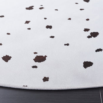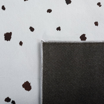 As for style, the rug?s design showcases a playful yet sophisticated pattern. The scattering of black speckles across the ivory background creates a dynamic visual texture that can beautifully break up solid colors or harmonize with more intricate prints.