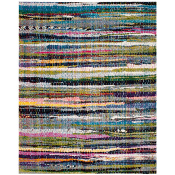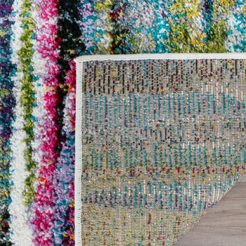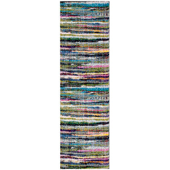 Crafted with a power-loomed technique to ensure precision and durability, our rug showcases an array of vivid hues intricately woven to create a dynamic striped pattern that captures the eye. The polypropylene pile construction gives it a lush 1/2" height, perfect for sinking your toes into after a long day.