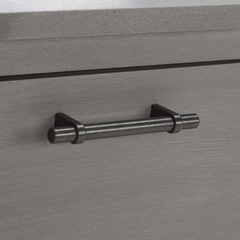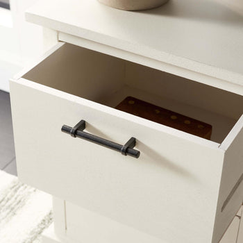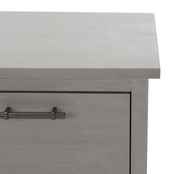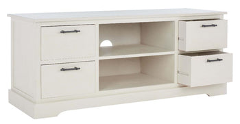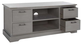 Modern minimalism is given an elegant, traditional touch in this Filbert Media Stand. Filbert's open shelves are perfect for electronics or consoles, and four drawers provide ample space for games, movies, remotes, or wires. Designer's love its Decor smart whitewashed grey finish.