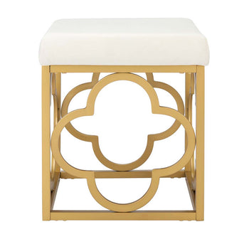 Traditional class meets modern glamour in this fabulous Fleur Ottoman. Fleur's open quatrefoil design brings airy elegance the entryway or living room or master suite. Shimmering in a gold liquid finish and cream velvet seat, Fleur seamlessly enriches the color scheme of any decor.