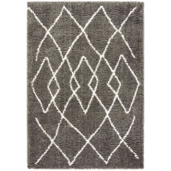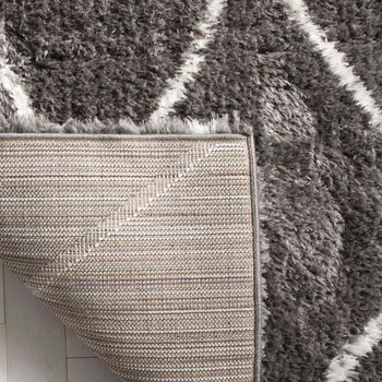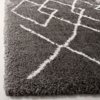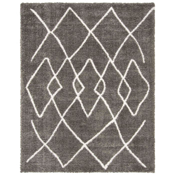 The striking charcoal base of this rug is elegantly complemented by a contemporary ivory geometric pattern, bringing a touch of sophistication and depth to any room. Its shag style offers a cozy, indulgent texture that is both trendy and timeless, making it a versatile addition to an array of interior decor themes.