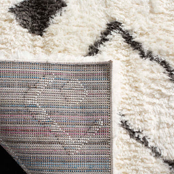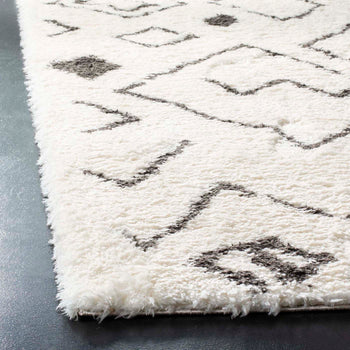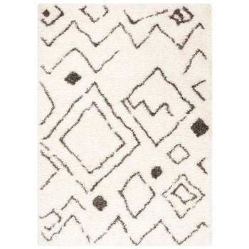 The rug's chic Ivory and Charcoal palette offers a striking contrast, while its Shag style introduces a tactile dimension that invites touch and adds warmth. Its engaging pattern, as seen in the image, showcases an array of charismatic geometric shapes, perfectly complementing modern, minimalist, and eclectic decors.