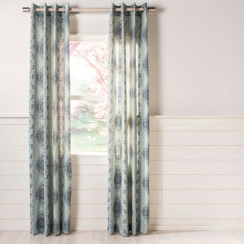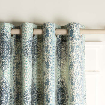 Moroccan textile artistry becomes boho chic interior Decor in the breezy appeal of the Florina Window Panel. A blend of synthetic and linen fabric, colored in blue and ivory, is a brilliant filter for sunlight while the timeless charm of floral vines, medallions and geometric motifs adds distinctive character to room decor. Florina is made with sleek, polished metal grommets for easy installation.