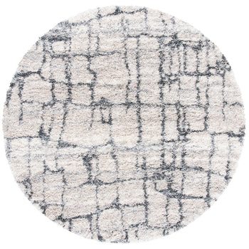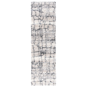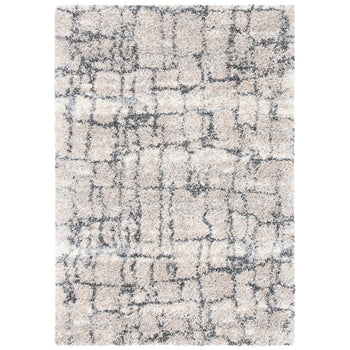 The enchanting color palette of ivory and grey, illustrated in this patterned image, exhibits an abstract grid design that adds visual interest and contemporary flair to the shag and Flokati style of the rug. It's a statement piece that's equally at home in a minimalist setting or amidst a more eclectic decor.