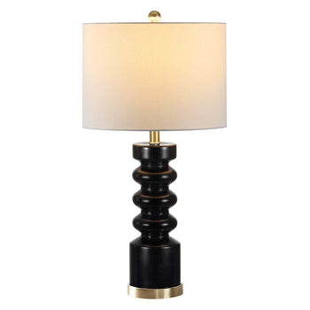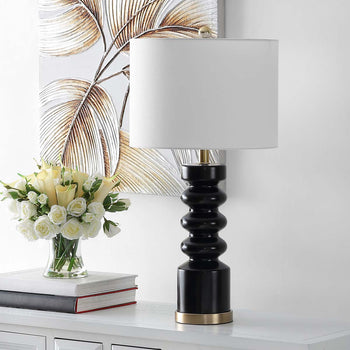 Substantial style for contemporary industrial Decor, this Frayen Table Lamp is a favorite among modern artists. Frayen's undulating silhouette in sleek black glass is absolutely enthralling, and a tapered drum shade ensures Frayen is at home in any interior.
