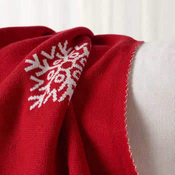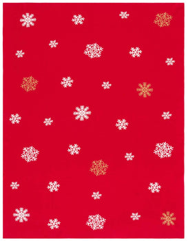 Bundle up cozy by the fire with this fabulous Frosty Wish Throw Blanket. Beautifully designed with a scattering of white and gold snowflakes atop a rich red backdrop, this comfy seasonal accessory is sensationally soft in smooth cotton yarns.