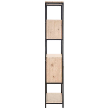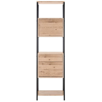 Elegant and statuesque, this Mid Century styled Gabrielle Etag?re brings a retro blend of sleek drawers and open storage to the living room or study. Designed with black iron and a natural oak finish, designers also use it in the dining room for easy storage and display.