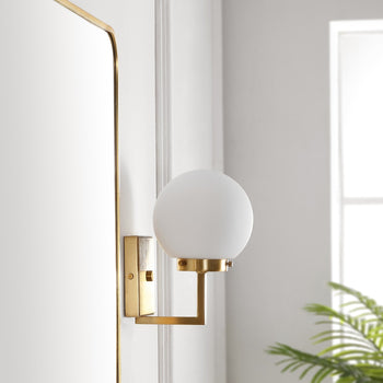 Brighten up your home with the timeless elegance of our Ganon wall sconces. Taking inspiration from vintage lamps, the wall sconce is refined to its striking essentials. A sleek and upright arm holds our eye-catching spherical glass shade. It combines the sheen and shine of brass with the elegance of clear glass to make a sleek statement on your wall. The clear glass shades allow the bulb to shine, illuminating your home with warm ambient light.