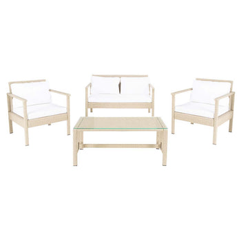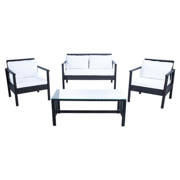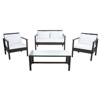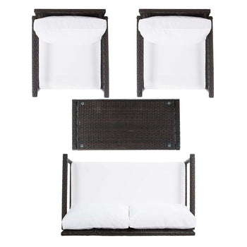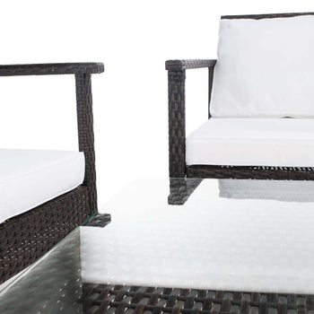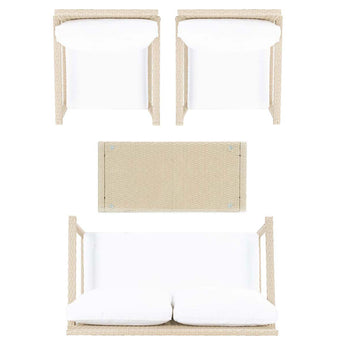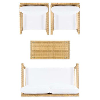 Tropical British Colonial style is given a modern coastal update in this deluxe Garnen 4 Piece Living Set. Garnen's modern, clean lined frames are beautifully offset by woven wicker, and the plush white cushions on its two armchairs and loveseat are ultra comfortable. Includes matching glass topped coffee table.