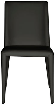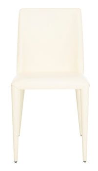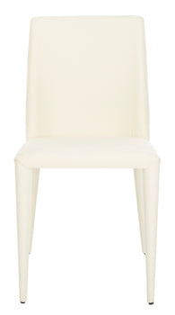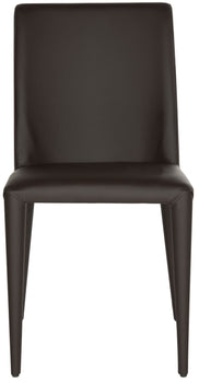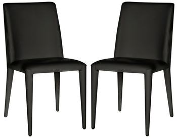 Modern elegance defines the clean cut lines of this set of two side chairs combining the tactile quality of leather with a high tech sculpted silhouette. Crafted of PU leather and iron, this design is a contemporary kitchen or dining room essential.