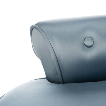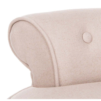 The adorable Georgia vanity chair is petite enough to tuck in a bathroom or bedroom, and brimming with feminine style. Graceful birch wood legs with distressed grey finish, deep seat and diminutive button tufted back are designed for indulgent comfort. Upholstered with pearl beige viscose/linen blend fabric with self welting and brass nail heads for a decorator touch.