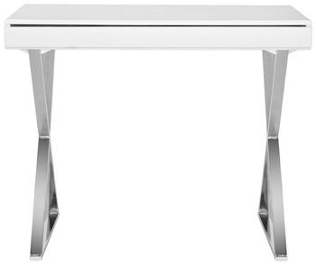 So simple, yet elegant and full of charm, the contemporary Gordon desk features x shaped silver painted finish legs, white lacquered top, and a discreet pull down compartment with ample room for storing a laptop, notebooks and other writing essentials.