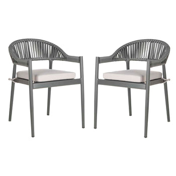 Create a statement on your patio with this set of contemporary stackable rope chairs. The grey tones of its nylon rope back, wicker frame, and soft cushion create the perfect neutral palette for any modern décor.