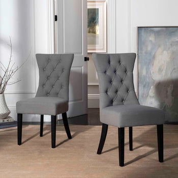 Chic and luxurious, the set of two Gretchen Side Chairs brims with designer details. Gretchen's hourglass silhouette features diamond tufting in easy care granite linen, complementing birch wood legs in an espresso finish.