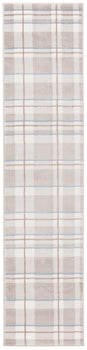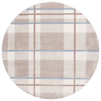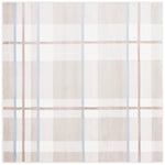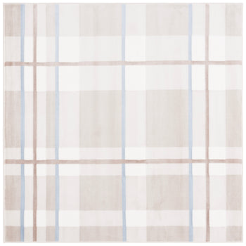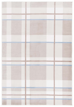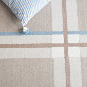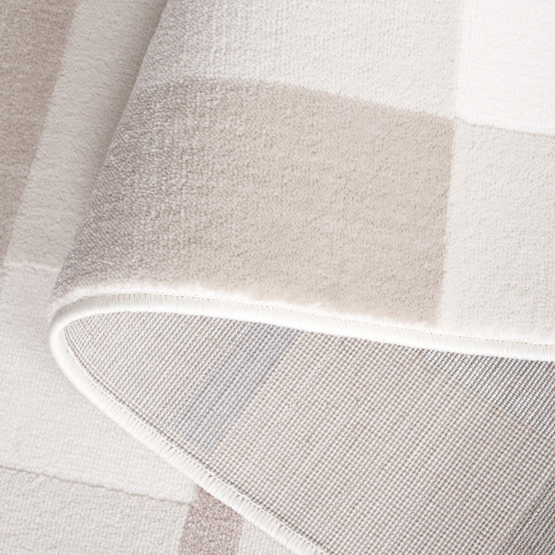 The contemporary design features a harmonious blend of beige and light blue hues, creating a serene and inviting atmosphere in any room. Its pattern showcases a modern grid with clean lines that intersect to form a checkerboard-like pattern, giving the rug a minimalist yet visually striking appeal.