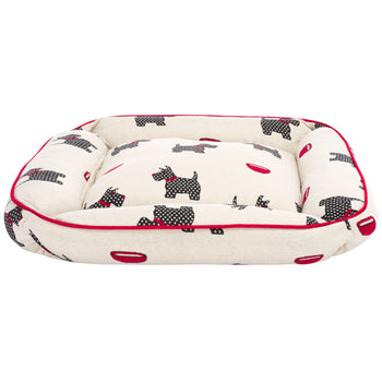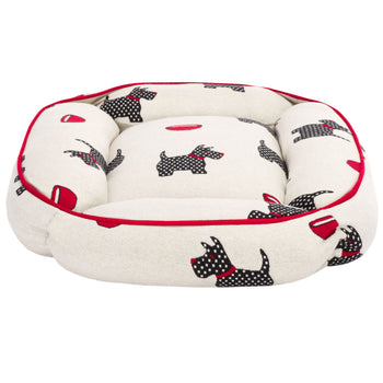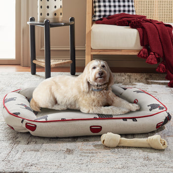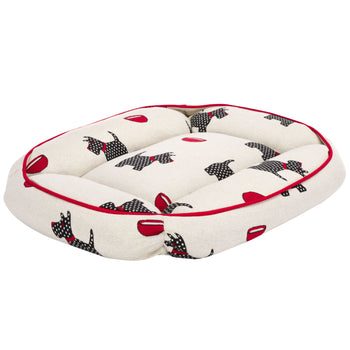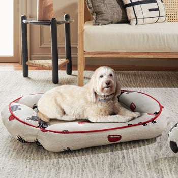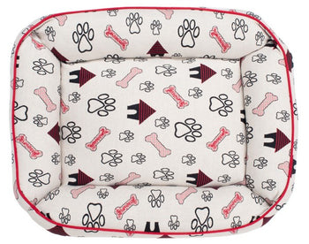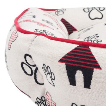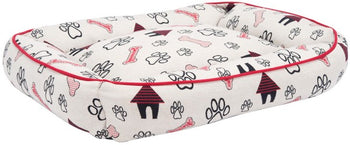 Introducing the Grover Dog Bed: the ultimate cozy retreat for your furry friend! Crafted with love in India, this soft, plush bed features a charming ivory and red rug pattern adorned with playful paw prints and dog houses, bringing a splash of style to your pet's space. The rectangular bed is perfectly sized for snuggling. Made with a cotton cover and filled with polyester for unmatched comfort, this bed promises durability and easy care simply toss it in the wash when needed. The cotton backing ensures the bed stays put, avoiding any unwanted slips. Give your pet the gift of comfort with this washable, cozy haven.