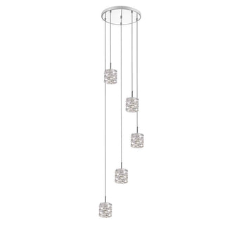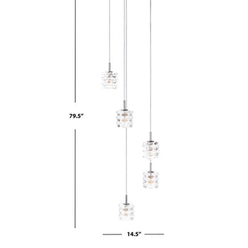 Designed to highlight the sublime beauty of refined minimalist style, this contemporary pendant light adds instant modern luxury to any interior. With their radiant silver finish aglow, 5 beautiful glass and metal lights elegantly cascade from its base.