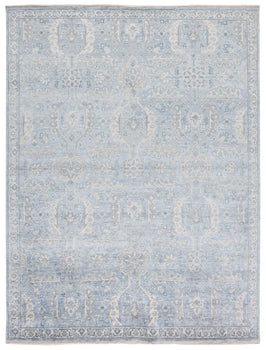 The artful combination of materials and hand-knotted technique ensures each rug is unique, with slight variations that add to its character and sophistication. Embrace the elegance and tranquility of this beautiful light blue area rug, a timeless addition to any room seeking a touch of understated luxury.