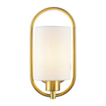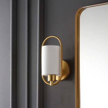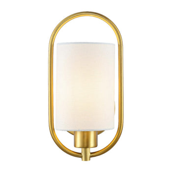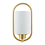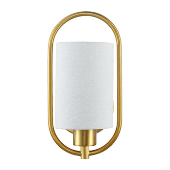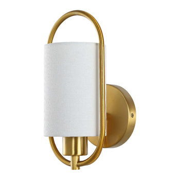 A graceful interplay of artistic negative space and classic styling, this Haldea Wall Sconce emanates timeless elegance. Haldea's off-white fabric shade is perfectly balanced by its shimmering brass frame, and designers love using them in pairs to frame a grand mirror or spotlight a treasured display.