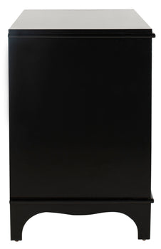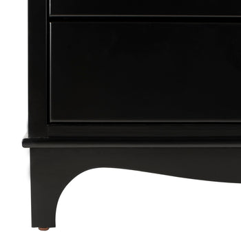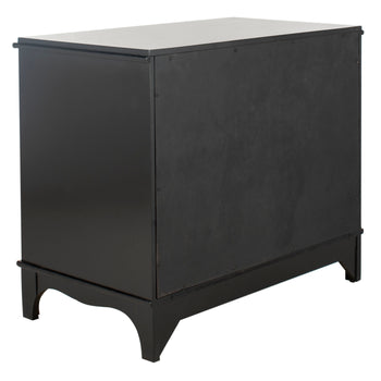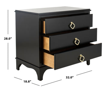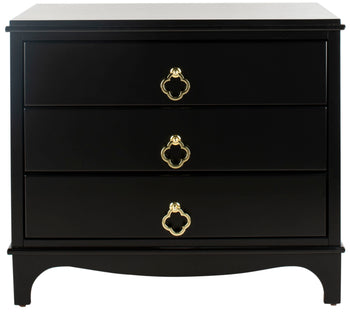 A striking blend of Old World elegance and modern glamour, this Hannon Nightstand is a classic-contemporary icon. Hannons gently scalloped apron is perfectly paired with the gold quatrefoil pulls on its three drawers that beautifully shine against a sleek black finish.