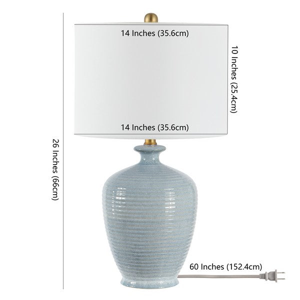 Enrich your Decor with this alluring Hanron Table Lamp. Hanron's mottled blue striations beautifully enhances its striking ceramic silhouette while a white drum shade makes Hanron perfect for any contemporary interior.