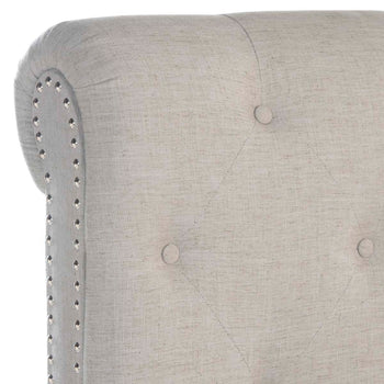 Get the look of a bespoke designer bedroom with an exquisite fully upholstered bed covered in crisp navy blue linen. Its curved sides, rolled button quilted top, black finished feet and oversized silver nailheads recall French grandeur.