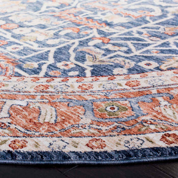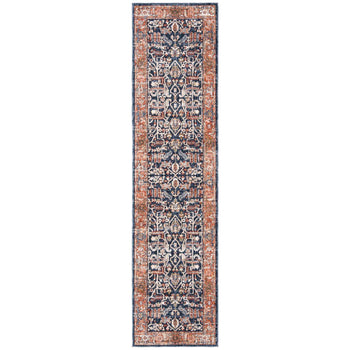 The runner's traditional style is beautifully expressed through its intricate pattern, a blend of navy and beige hues intertwined with splashes of warmer tones, creating visual depth and an inviting ambiance. Each detail of the pattern, showcasing classical motifs and borders, speaks to the artistry of its design, certain to complement a variety of interior decors from classic to contemporary.