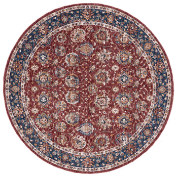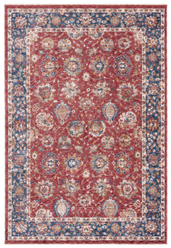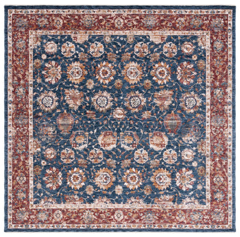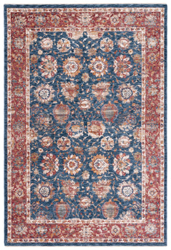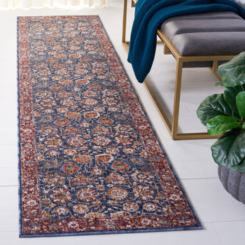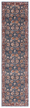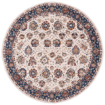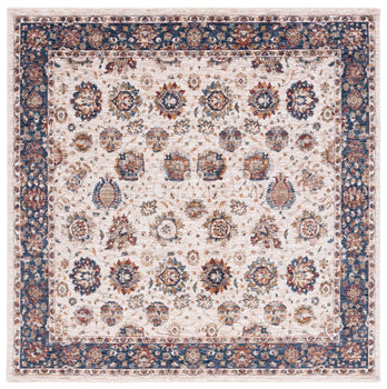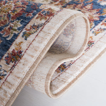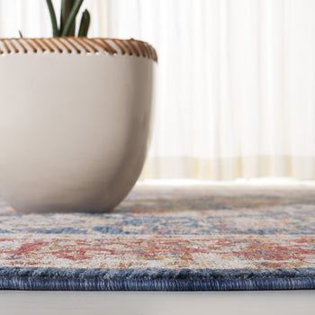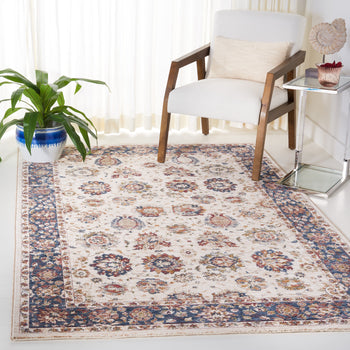 The rug features a rich navy border enclosing an intricate ivory pattern with hints of earthy and jewel tones, creating a harmonized look that is both eye-catching and versatile.