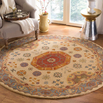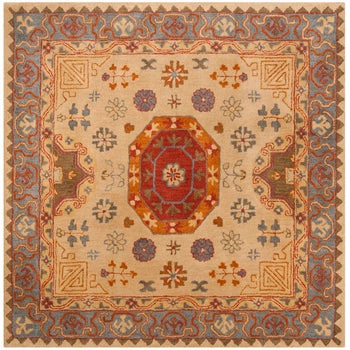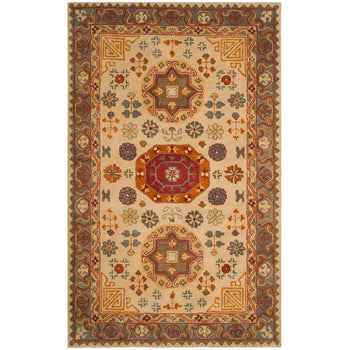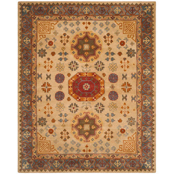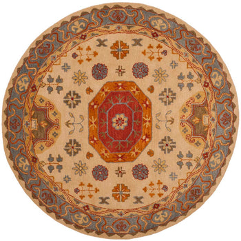 The rug flaunts a rich palette of warm beiges and a medley of multi-colored accents that bring out a sophisticated yet inviting atmosphere in any room. The dominant beige serves as a serene backdrop for the vibrant motifs that draw inspiration from traditional patterns.