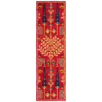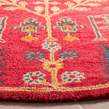 Whether nestled under a cozy seating arrangement or making a statement in your entryway, this RED / MULTI round area rug is a versatile addition to classical and contemporary interiors alike. Experience the blend of artisanal craftsmanship and opulent design with this must-have decor centerpiece.