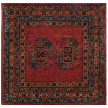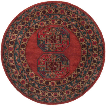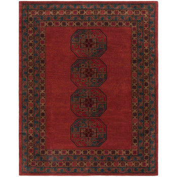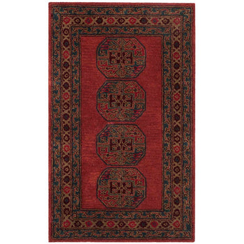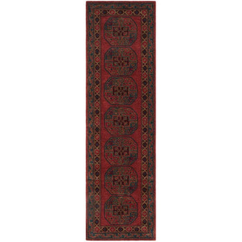 The rug's traditional pattern features a series of medallions, surrounded by intricate borders, giving it a classic look that is both stately and inviting. The palette is dominated by deep reds, complemented by accents of green and beige, providing a regal and sophisticated appearance that will enhance the decor of any room.