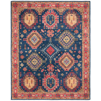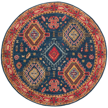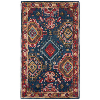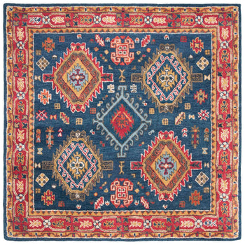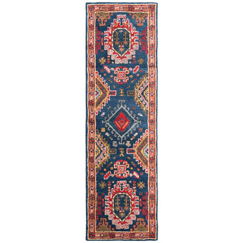 The rich navy blue and bold red colors provide a striking contrast that brings the intricate patterns to life. The design draws inspiration from classic motifs, featuring a harmonious mix of geometric shapes and symbolic figures that are reminiscent of ancient tapestries.