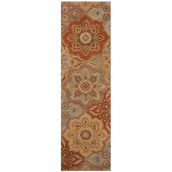 The exquisite runner showcases a rich tapestry of colors, blooming with shades of terracotta, gold, sky blue, and neutral beiges, creating a vibrant 'MULTI' palette that promises to warm up any floor space. Each hue harmoniously weaves together to form intricate traditional patterns, reminiscent of vintage heirlooms, carrying the legacy of artisanal craftsmanship.