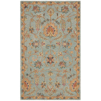 Adorned with intricate designs, the rug features a melange of ornate scrollwork, florals, and refined decorative elements. The pattern is masterfully set against the light blue background, making the rich colors stand out, creating a delightful visual feast for your floors.