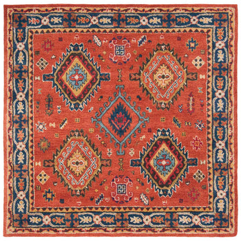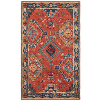 Crafted with meticulous attention to detail, this runner rug boasts a plush pile height of 3/8" for a soft underfoot experience. The intricate pattern depicted in the image infuses your home with a classic yet bold design, featuring dynamic geometric shapes and a harmonious blend of rust reds and deep navy blues, complemented by touches of ivory, green, and gold tones.