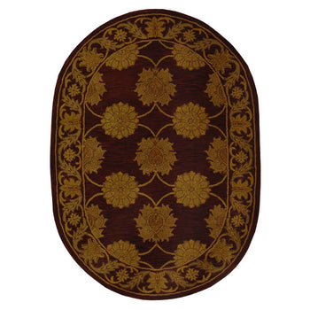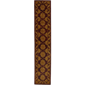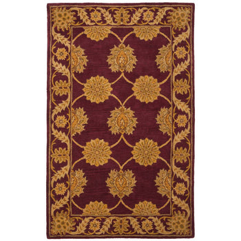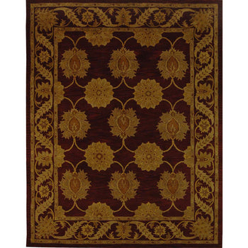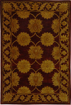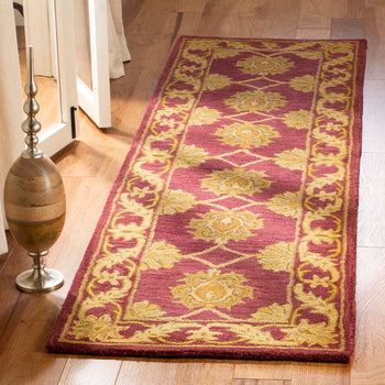 The rug features an ornate pattern that exudes elegance, boasting symmetrical floral motifs that are timeless in their appeal. The golden accents on a rich maroon background create a stunning contrast that is both warm and inviting. The defined border adds a touch of finesse, framing the design beautifully.
