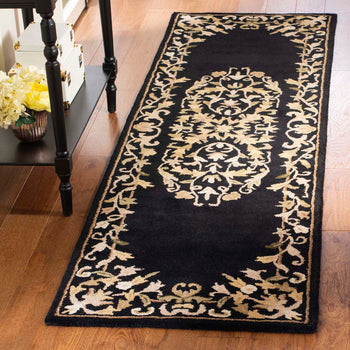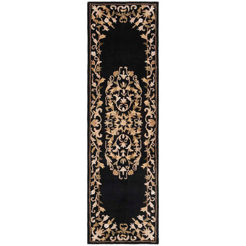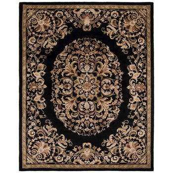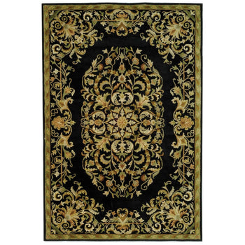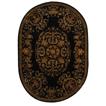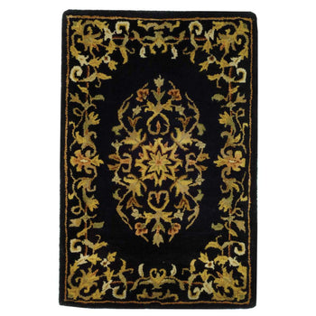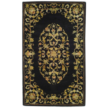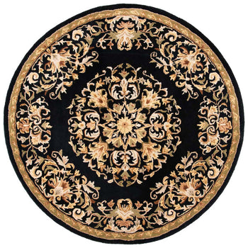 Experience the timeless elegance and master craftsmanship of our hand-tufted wool area rug, an exquisite addition to any room. Crafted in India, this round rug with a 3'-6" diameter and a comfortable 3/8" pile height offers both luxury and durability. The sumptuous black wool foundation is adorned with an ornate traditional pattern, featuring intricate florals and scrollwork in a harmonious palette of soft beiges and golds, reminiscent of classic heirloom designs.