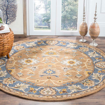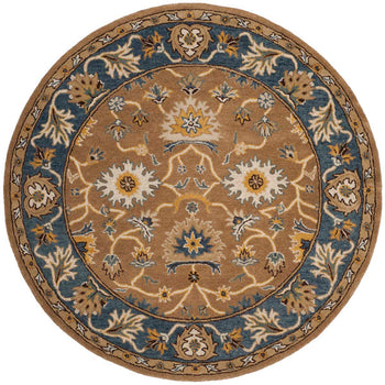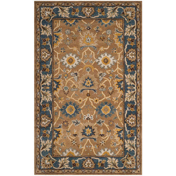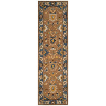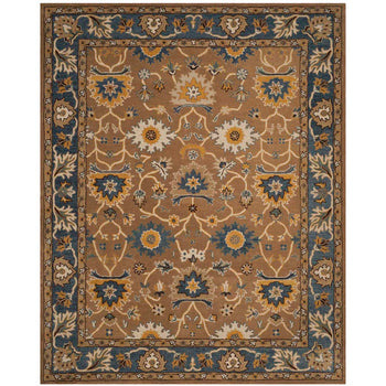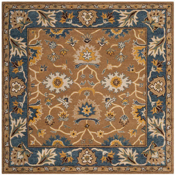 The sophisticated patterning features a harmonious blend of camel and blue hues, beautifully complemented by touches of ivory, gold, and deeper blues to create a serene yet intricate design. Each motif within the pattern is meticulously detailed, showcasing the exceptional craftsmanship of the hand tufted technique.