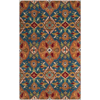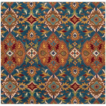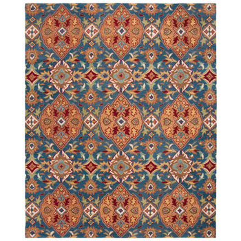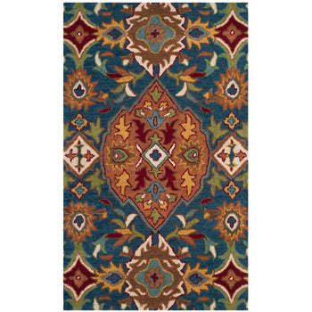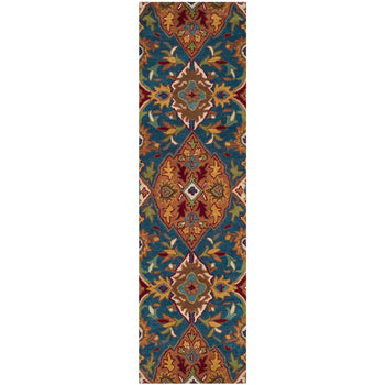The rug's height of 1/2" provides an ideal balance of comfort and ease of maintenance. Artistically composed in rich camel and blue hues, it boasts an intricate pattern that exudes a timeless appeal. The centerpiece of the design is a bold, symmetrical medallion, surrounded by a complex array of floral and geometric motifs that dance across the surface in harmony.