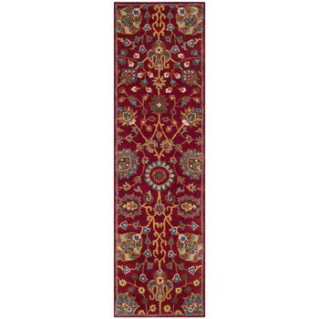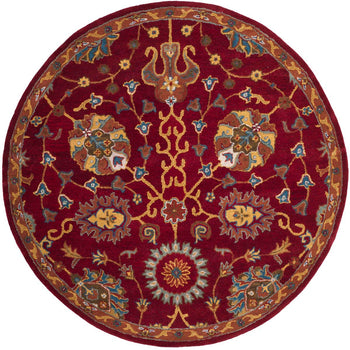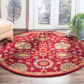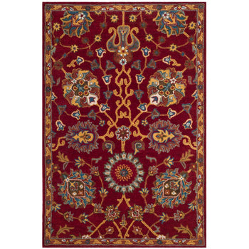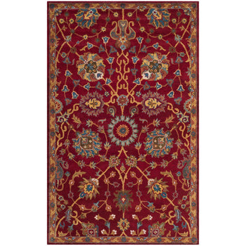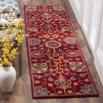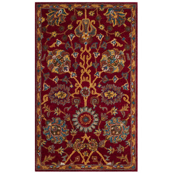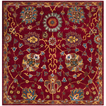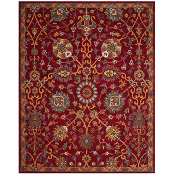 Rich in color and sophistication, the stunning red backdrop sets a regal stage for the intricate pattern that adorns this exquisite piece. Traditional motifs dance across the rug, featuring symmetrical floral arrangements and ornamental elements, highlighted in a harmonious palette of gold, blue, and subtle earthy tones that create a sense of timeless beauty.