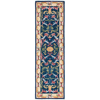 The intricate patterning of this rug is a work of art, displaying a harmonious blend of navy and ivory hues, accented with touches of red, gold, and green. The central motif is framed by a series of decorative borders, showcasing a thoughtful attention to detail and composition that will be the centerpiece of any room.
