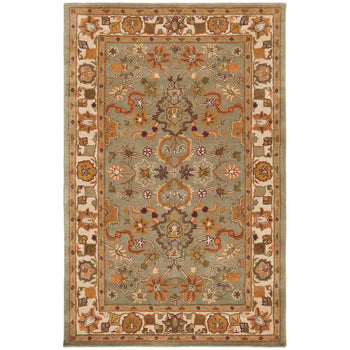 The rug's captivating design, as seen in the image, features intricate patterns that weave floral and traditional motifs into a harmonious visual statement. The light green field is beautifully contrasted with floral and vine motifs in hues of beige, orange, and subtle purple accents, imparting a serene yet captivating allure to any room.